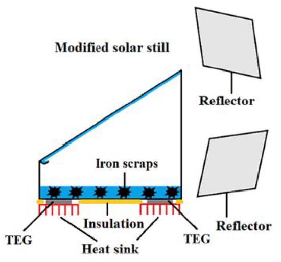 Schematic representation of a solar still integrated with thermoelectric generators, iron-based thermal storage, and reflective mirrors for enhanced desalination efficiency. Reprinted with permission from Ref. [37]. Copyright 2023, Elsevier.