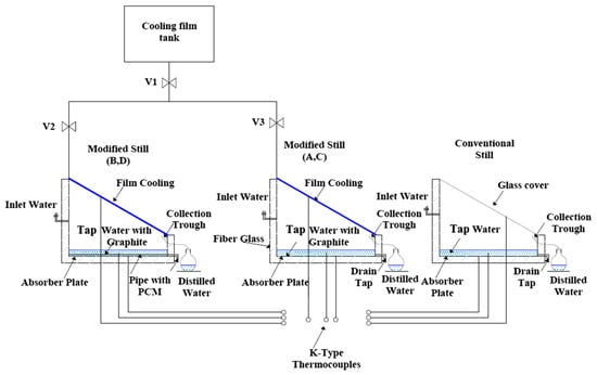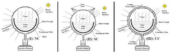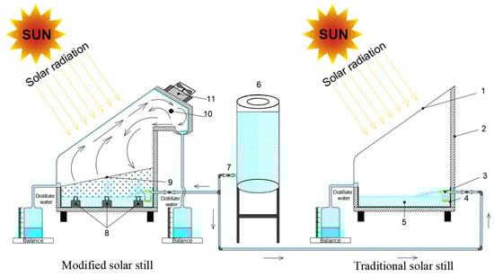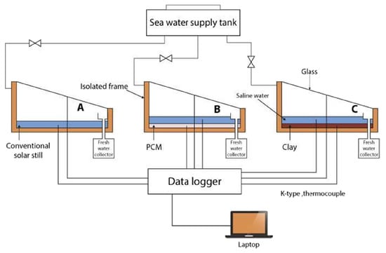 In a study conducted by Mohammed et al. [38], the performance of a single slope/single-tank solar still for saline water desalination was evaluated under the climatic conditions of Qena city in Upper Egypt. The study compared a CSS, a PCM-assisted solar still, and a local clay material-assisted solar still to enhance water yield during both day and night operations (Figure 13).