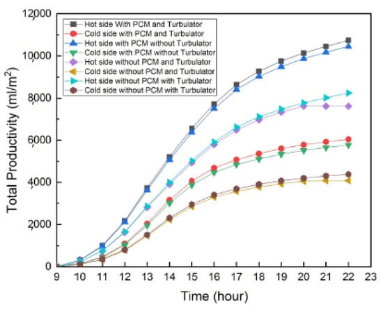 The total desalinated water output from the conventional solar still, the solar still enhanced with phase change materials (PCMs), and the solar still utilizing local clay was approximately 3885 mL/m2, 4704 mL/m2, and 5388.6 mL/m2, respectively, with daytime yields of 3637.2 mL/m2 and nighttime yields of 247.8 mL/m2. The use of PCM resulted in a yield increase of about 21%, while the local clay material improved yields by approximately 38.7% (Figure 14).