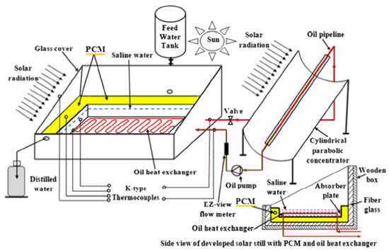 Schematic representation of a solar still system incorporating paraffin wax for latent heat storage and an oil-based heat exchanger for enhanced feedwater heating. Reprinted with permission from Ref. [41]. Copyright 2017, Elsevier.