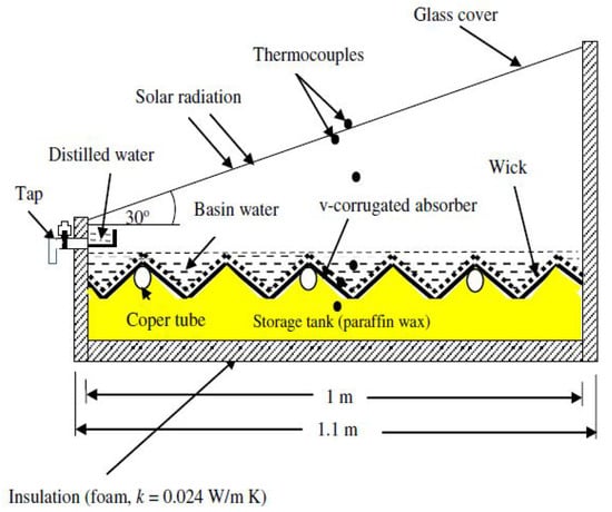 Schematic representation of a V-corrugated single-sided solar still integrated with paraffin wax-based phase change material for optimized thermal performance. Reprinted with permission from Ref. [43]. Copyright 2016, Elsevier.