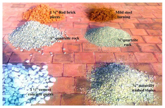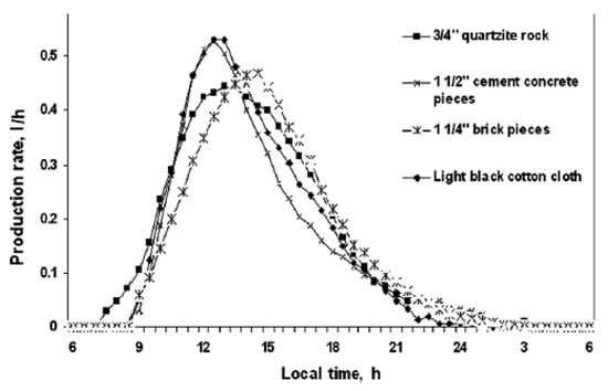 Murugavel et al. [44] explored the impact of various sensible heat storage materials on a double-slope SS system. They investigated materials like quartzite rock, washed stones, red bricks, cement concrete, and iron scrap placed in the system’s water basin (Figure 20). Their study revealed that utilizing 0.75-inch quartzite rock as the storage material yielded the highest productivity increase of 6.2%. Figure 21 illustrates the hourly productivity variations observed with different materials.