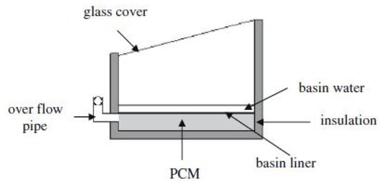 Schematic representation of a single-slope solar still integrated with stearic acid-based phase change material for enhanced productivity and thermal efficiency. Reprinted with permission from Ref. [45]. Copyright 2009, Elsevier.
