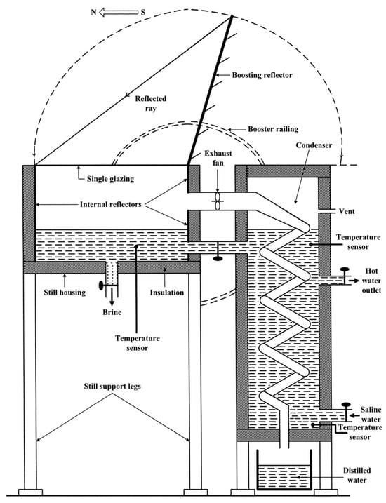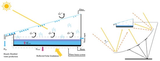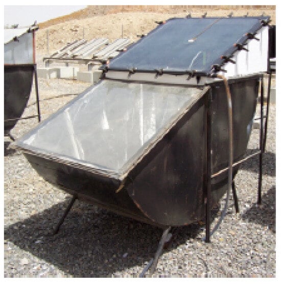 Integrating reflectors into solar still (SS) systems presents another promising avenue for performance enhancement. By strategically positioning reflective surfaces within or around the still, incident solar irradiation can be amplified, leading to increased water temperatures and, consequently, higher evaporation rates. Soltanian et al. [46] proposed a mirror-enhanced SS design and compared its performance to conventional stills through mathematical modeling (Figure 23). Their study highlighted the advantages of the enhanced design, including reduced glass temperatures, elevated water temperatures, and significantly higher solar irradiance levels. Notably, the proposed system demonstrated a substantial increase in production of water, from 7.5 to 24 L/D.