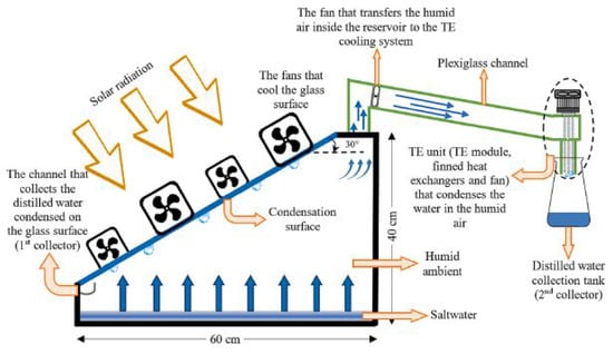 Schematic representation of a solar still system incorporating thermoelectric heating and cooling configurations for enhanced performance optimization. Reprinted with permission from Ref. [39]. Copyright 2022, Elsevier.