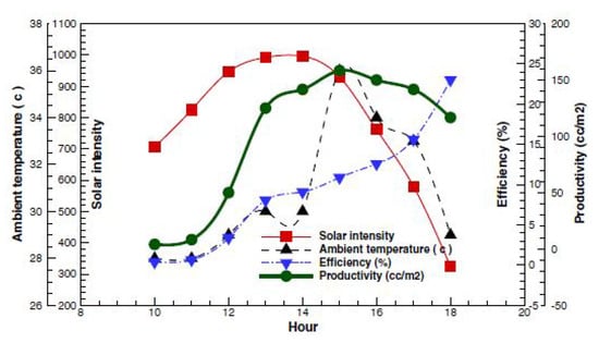 - Badran, O.; Al-Tahaineh, H. The effect of coupling a flat-plate collector on the solar still productivity. Desalination 2005, 183, 137–142. [Google Scholar] [CrossRef]