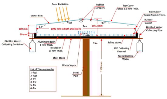 Al-Hinai et al. [29] created a mathematical model to explore how different conditions of weather and factors of design affect the output of a dual-slope solar still (SS) system. By employing an ordinary energy balance method, they calculated the heat transfer coefficient of evaporation, enabling them to evaluate the system’s productivity. Their findings indicated that enhanced hourly productivity could be achieved under conditions of increased solar intensity, elevated ambient temperatures, higher wind speeds, larger cover slope angles in winter, steeper cover slope angles in summer, thicker blackened basin insulation, elevated feed water temperatures, and shallower water depths. The study reported a productivity per year of (4.15) kg/m²·day and a cost rate of 0.02 USD/L (equivalent to 19.5 USD/m³). In Figure 4, the illustrated diagram of the created SS system is shown.