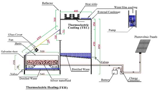- Nazari, S.; Safarzadeh, H.; Bahiraei, M. Performance improvement of a single slope solar still by employing thermoelectric cooling channel and copper oxide nanofluid: An experimental study. J. Clean. Prod. 2019, 208, 1041–1052. [Google Scholar] [CrossRef]