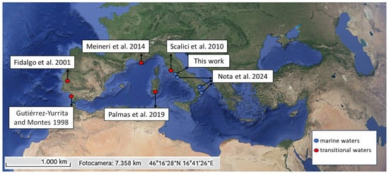 Sites with Procambarus clarkii present in European coastal habitats. The blue and red dots indicate marine and transitional waters, respectively. The image was obtained by Google Earth and Copernicus. Data on the presence of P. clarkii were obtained by studies like Gutiérrez-Yurrita and Montes (1998) [41], Fidalgo et al. (2001) [63], Scalici et al. (2010) [61], Meineri et al. (2014) [67], Palmas et al. (2019) [66], Nota et al. (2024) [62], and Scalici and Gallitelli (2025, this work).