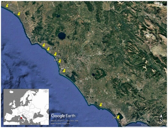 Records of the red swamp crayfish Procambarus clarkii in transitional and marine waters of Tyrrhenian central Italian coasts. The red dot indicates the study area in central Italy, while the yellow points indicate the specific locations. Specifically, Marina di Pescia, Santa Severa, and Astura are brackish temporary ponds; Riva dei Tarquini and Fiumicino are estuarine zones; Torre Flavia and Sabaudia are brackish wetlands; and Passoscuro is the marine locality where P. clarkii was found. The image was obtained from Google Earth and Copernicus. MP = Marina di Pescia, RT = Riva dei Tarquini, SS = Santa Severa, TF = Torre Flavia, PA = Passoscuro, FR = Fregene, FI = Fiumicino, AS = Astura, and SA = Sabaudia.