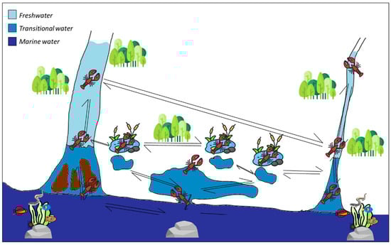 Since some crayfish are able to survive high salinities, this adaptative process ought to be better investigated in order to understand (i) whether crayfish select transitional waters as a new elective habitat or merely use them as a biological corridor (given that salt tolerance, combined with their dispersal ability, may facilitate such movement—see Aquiloni et al. [40]) (Figure 3), and (ii) which driving environmental and evolutionary forces may facilitate the colonization of transitional waters within the area of introduction (such as the absence of natural competitors and/or predators and/or parasites). Beyond the adaptive aspects, this represents an issue of concern in the habitat conservation field, particularly with regard to (1) the massive introduction of non-indigenous crayfish in many European countries [23,26,27,72]; (2) the control of alien threats in coastal habitats (see [61,63,64,67]); and (3) their increasingly frequent presence in transitional waters.