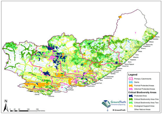 Figure 1 shows that the major towns in the Great Kei catchment (Primary catchment S) are East London, Queenstown, and Bisho, the latter two being the inland regional centers. DWS [20] reported that the Keiskamma River is dominated by several irrigation developments (citrus). Further, the Buffalo River is also dominated by commercial vegetable farming, such as tomatoes, maize, lucerne, and cabbage. The study [20] revealed that the presence of higher rainfall in the areas of the Amathole Mountains, the upper Keiskamma and Buffalo Rivers led to high afforestation.