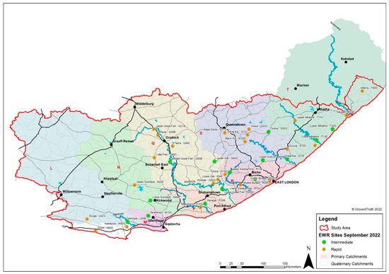 Field assessment preparations for surface water required tools such as Google Earth (version 10.79.03), Geographic Information System (GIS) (https://dwa.maps.arcgis.com/home), and Global Positioning System (GPS) (Garmin GPSMAP 67i) to locate water users and landcover features in the study area. Google Earth imagery was used to provide landcover information for areas that were not easily accessible, like protected areas, mountainous areas, and water bodies. Further, the assessment targeted areas (within the study area) with historical water resource data, such as gauging weirs/streamflow gauging stations, borehole sites, and ecological water requirements (EWRs) sites, or environmental flows sites. EWRs refers to the flow patterns (such as duration, timing, and magnitude) and quality of water needed to sustain a riverine ecosystem in a particular condition [24]. Twenty-one EWRs sites and 28 gauging stations were visited in the study area, and these EWRs sites were adopted from the study by DWS [25] while the gauging stations’ data were obtained from the DWS (www.dws.gov.za/hydrology, accessed on 28 February 2025). At each EWRs site, selection of cross sections was done, assessment of the cross-sectional profile of the river channel was conducted using a Total Station (a survey instrument) at each EWRs site, a survey of longitudinal water slope was conducted, discharge was measured with the aid of a current meter, GPS coordinates and pictures of the site were captured [26]. Assessment at the EWRs sites included macro-invertebrates, vegetation, instream and riparian habitat, hydrology, fish, benthic diatoms, and in-situ water quality. The results were important to ascertain whether the objectives of maintaining and/or improving the ecological condition of the riverine ecosystem to facilitate sustainable use of the resource while maintaining the integrity of ecology were met [27]. Figure 2 depicts the spatial distribution of EWRs sites in the study area.