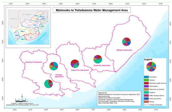 Masangu [38] reported that statistical analysis is done to discover patterns among the data. In the current study, the identification of sectoral water users from the WARMS dataset was analyzed by using descriptive statistical analysis (Microsoft Excel 2016). The expected output of this analysis was a comprehensive list of identified surface and groundwater users and their uses. The list of sectoral water users and associated uses was presented in pie charts for a better understanding.