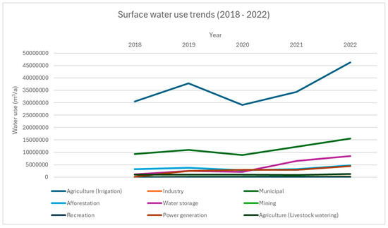 Figure 4 shows fluctuating growth in water use across the catchments from 2018 to 2022. Trend analysis showed that total water use increased over time. Increases in water use indicate that more licenses were issued. Figure 4 shows that sectoral water use by agriculture and municipalities increased over time. An increase in total water use could put water resources under stress. Moreover, the impact of climate change may exacerbate current water resource challenges, affecting the supply, demand, and water quality in WMA7. The water use dropped slightly between 2020 and early 2022. This could be due to drought (due to erratic rainfall) and the outbreak of COVID-19, which led to the country’s lockdown during the period.