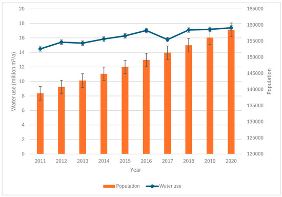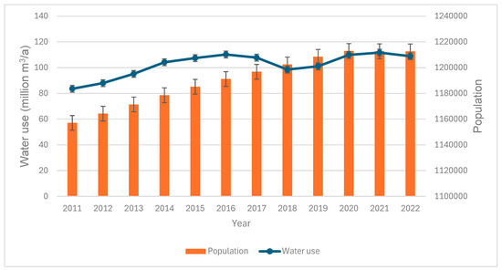 To obtain a specific picture of the total use pattern in the study area, the total water use pattern was scaled down to a local authority or municipal level. Globally, the UN [39] estimated that more than 55% of the global population lives in cities and that 394 of the world’s cities have a population that exceeds 1 million inhabitants. As a result, the expansion of urban areas continues to pose a significant threat to natural dynamics, water resource availability, and quality [39]. In the current study, municipal supply services are one of the major water consumers. Two cities (Gqeberha and East London) in the Nelson Mandela Bay Municipality (NMBM) and Buffalo Metropolitan Municipality (BMM) were examined. Municipal water use represents the amount of water withdrawn to provide the needs of the two cities, including households, industries, commercial, and mining uses to produce the goods and services society desires. The NMBM historical water use and population growth data were sourced from the Algoa reconciliation study [27] and outlined in Figure 5.