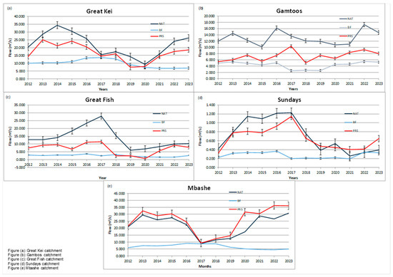 To realize the objectives of the current study, both primary and secondary flow data obtained from field assessment, national database (Hydstra), and other sources mentioned in the previous bullet-point list, such as the recalibrated data for the Algoa and Amatole reconciliation studies [27], were used. Baseflow and natural flow time series obtained from these studies were used and adjusted by catchment area to obtain the flows at the selected EWRs sites and gauging weirs or streamflow gauging stations in the study area. The monitoring stations are managed and maintained by the South African Department of Water and Sanitation. Several flow monitoring stations are equipped with real-time telemetry data transmission systems, and monthly data is downloaded from dataloggers. Transmitted data from systems is accessible at www.dws.gov.za/hydrology, accessed on 18 February 2025. However, the streamflow method did not consider the impact of various factors such as climate change, other natural processes, and human activities that could potentially affect water availability, quality, and system health. Field assessments were undertaken in May 2022 and November 2022 to collect present-day flow data. The present-day modeled flows were from both WR2012 and from the updated, recalibrated Algoa and Amatole studies. Briefly, the following sampling techniques were applied during field assessment: At each EWRs site and selected gauging weirs, selection of cross sections was undertaken, assessment of the cross-sectional profile (vertical subsection) of the river channel was conducted using a Total Station at each site, the width and depth of each subsection was measured, a current meter was put in a flowing water to measure the water velocity in each subsection, the subsection area was then multiplied by the water velocity to calculate the discharge in each subsection and then the discharge of each subsection was added to calculate the total discharge. The discharge data, for October 2021 to September 2022, in million cubic meters per second (m3/s), were then analyzed and interpreted using a hydrograph. Hydrograph results (baseflow, natural flow, and present-day flow) were then linked to water users in the study area.