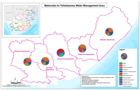 The South African National Water Act (NWA) [15] and National Environmental Management Act (NEMA) [16] recognize that sustainable use of water for the benefit of all users is achieved through better water resource management. Both these overarching pieces of legislation take into consideration the use of the natural environment in a sustainable way for generations to come. Chapter 4 of the NWA deals with water use, and it is broadly defined in the Act. According to the NWA, water use includes storing, diverting, taking, and discharging water, as well as any activities that reduce streamflow. In general, water use activities are regulated through the granting of formal water rights, such as licenses, permits, or concessions, to ensure compliance with water use conditions [17]. Although Bea et al. [18] highlighted that illegal water use often contributes to over-exploitation, unreliability of water-related data, and severe gaps in policy implementation, unlawful water use is very difficult to estimate. The overall aim of the current study is to quantify sectoral water use for both surface and groundwater in order to understand the demand side of water availability within Water Management Area 7 (WMA7). This Water Management Area, located predominantly in the Eastern Cape Province, has been historically understudied, yet it represents an important developing region in South Africa where water use is expected to increase considerably over time. Further, the catchments within the WMA7 are important for conservation and have recognizable protected areas, natural heritage, and cultural and historical sites that require protection. Alley et al. [1] reported that, as competition for water grows due to irrigation, human population growth, energy production, and the environment, the need for water resource assessment for use by sectors to aid water resource managers also grow. The specific objectives were: (1) To identify priority sectoral water use per catchment in WMA7. The expected output of this objective was a comprehensive list of identified surface and groundwater users and their uses per catchment. (2) To determine water use trends for identified priority sectors over a 5-year period by sourcing historical water use data of the study area. (3) To determine water resource use impacts in the study area. Due to the diversity and complexity of water use patterns and socio-economic development in the study area, a clear understanding between water uses, water resource deterioration, and water use conditions enforcement remains elusive. Therefore, improved information on water withdrawal, discharge, and return flow by sector will allow water resource managers and policymakers to make more effective decisions for the future.