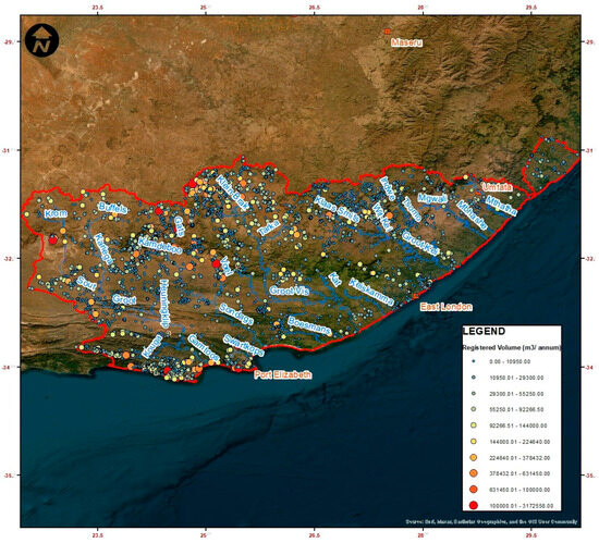The objective was to collate water use registration information and identify the main licensed water users within the study area. An extensive review of previous studies and national databases was undertaken to understand the water use setting in the study area. Similar to Evenson [30], the National Groundwater Archive (NGA) and Water Authorisation and Registration Management System (WARMS) databases for water resources were acquired to provide a spatial distribution of water use in the study area. As observed by Jovanovic et al. [7], the WARMS database is primarily used to account for the registered volumes of water used by different sectors, such as agriculture, industry, urban, etc. Further, it should be noted that WARMS is not a database of actual water use. Rather, it refers to the registered (licensed) water volumes. The Registration Guide of DWS [31] provides explanatory information and definitions of water uses in line with the National Water Act [15]. Water use includes storing, diverting, taking, discharging of water, and any activities that reduce streamflow [15]. According to NWA [15], water users requiring registration are individuals (e.g., farmers, small-holders, landowners or lessees), communities, companies and businesses, Water User Associations, and Water Services Providers (e.g., Water Boards). The WARMS provided adequate information required to identify which users are located where, water use volume, and possibly, water quality issues in the study area.