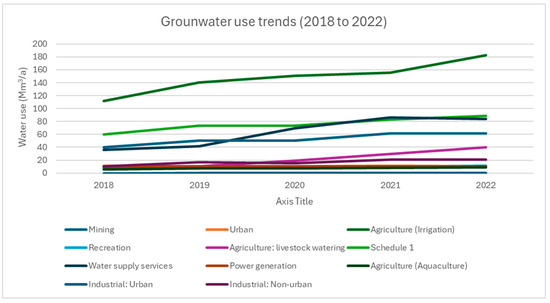 Groundwater users such as mining, recreation, urban, agriculture (livestock watering), agriculture (aquaculture), agriculture (irrigation), industry (non-urban), water supply services, schedule 1, power generation, and industry (urban) were identified and analyzed to show groundwater use trends over 5-year period (2018–2022) for the study area, as shown in Figure 10.