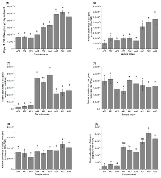 Figure 1. The abundances of 16S rRNA (A), sulI (B), tetX (C), cmlA (D), aac-lb-cr (E), and intI (F) gene copies in sediments from Nansi Lake subjected to various forms of human activities. The values shown represent the means from three replicates along with their standard errors. Distinct letters signify a significant difference (p < 0.05).