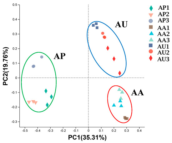 From the three sampling areas, a total of 3,454,952 high-quality sequences of the 16S rRNA gene were acquired through the Illumina MiSeq platform, averaging 127,961 sequences for each sample, with three replicate samples taken at each site across the three areas. Each sample was randomly re-sampled and yielded 60,000 sequences. A total of 8145 OTUs were identified, and the resampled OTU table served for further analysis. An evaluation of the OTUs revealed a high level of diversity among microbial communities. Microbial communities were dominated by Firmicutes (ranging from 12.84% to 36.72% of sequences), Proteobacteria (9.73% to 38.46%), and Chloroflexi (8.65% to 18.45%) across all locations. The α-Diversity indices indicated significant differences in community diversity (p < 0.01) between AP and AU, as well as between AP and AA, such as the Simpson indices and Shannon indices (Table 2). However, no significant differences were observed between samples from AU and AA (p > 0.05). Meanwhile, the ACE and Chao index indicate significant community richness differences (p < 0.01) between AP and RA, while there were no significant differences between AP and AU and between AU and AA. The PCoA analysis of the sequence data illustrated significant clustering based on locations, with the primary principal component (PC) scores registering PC1 = 35.31% and PC2 = 19.76% (Figure 2).