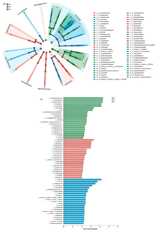 We conducted a further investigation to determine whether various human activities influence microbial community structure at diverse taxonomic levels. The microbial taxa that exhibit the most significant differences among areas are illustrated in Figure 3 with LDA scores. At the class level, AU and AA were clearly distinct from AP. AU showcased an elevated presence of Clostridia, Actinobacteria, Thermoleophilia, and Limnochordia, whereas AA exhibited a rise in Anaerolineae, Vicinamibacteria, Acidimicrobiia, and Bacteroidia. Additionally, more pronounced differences among the areas were observed at the order level. AU displayed an increase in Gaiellales, while AA was defined by a prevalence of Anaerolineales, Vicinamibacterales, Ignavibacteriales, Microtrichales, and Pirellulales. Furthermore, AU and AA were also notably different from AP at the family level. AU revealed higher quantities of Clostridiaceae, Bacillaceae, and Hungateiclostridiaceae, in contrast to AA, which was characterized by an increase in Anaerolineaceae and Pirellulaceae.