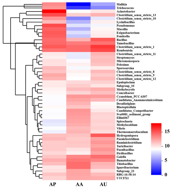 To further corroborate the differences in functional populations linked to human intervention, a heat map illustrating the 50 most prominent genera was created (Figure 4). The results showed that the majority of these dominant genera exhibited higher levels in AU and AA in contrast to AP. Certain phylotypes, including Methylocystis, Spirochaeta, Methylocaldum, and Vibrio, were found to be more prevalent in the sediments of both AA and AU, whereas others, like Desulfatiglans, Blastopirellula, and Thiobacillus, were exclusively found enriched in the sediments of AA. Acinetobacter, identified as a major genus, showed the highest abundance in AP, but the abundance significantly decreased in both AA and AU. AA was dominated by Romboutsia, Thiobacillus, and Ignavibacterium, while AU was dominated by Romboutsia, Bacillus, and Hydrogenispora. Clearly, Romboutsia was enriched in both AA and AU compared to AP.