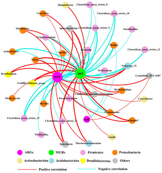 This study utilized network analysis to examine the connections of 100 predominant bacterial genera alongside five ARGs and MGEs pertinent to the study area (Figure 5). Overall, the networks based on the 16S rRNA gene comprised 37 nodes and 61 significant (p < 0.05) correlations with a Spearman’s correlation coefficient ρ > 0.7 or < −0.7. Most of the genera belong to Firmicutes and Proteobacteria at the phylum level. Twenty-nine bacterial genera were identified as potential hosts of ARGs, including Spirochaeta, Ignavibacterium, Desulfatiglans, Bacillus, Thiobacillus, Methylocaldum, Trichococcus, Malikia, and Vibrio, which may be associated with tetX and sulI. tetX had a stronger positive correlation with Spirochaeta, Vibrio, and Ignavibacterium than with other genera. sulI had a significant positive correlation with Cyanobium_PCC-6307 and two significant negative correlations with Trichococcus and Malikia, but the correlations were weaker in all correlations. Furthermore, thirty bacterial genera were also identified as potential hosts of MGEs, such as Spirochaeta, Vibrio, Exiguobacterium, Acinetobacter, Pseudomonas, Desulfatiglans, and Methylocystis, which may be associated with intI. intI had strong negative correlations with Fonticella and Malikia, and strong positive correlations with Ignavibacterium and Spirochaeta. Interestingly, both tetX and intI had strong positive correlations with Ignavibacterium and Spirochaeta, indicating that Ignavibacterium and Spirochaeta were hosts of both tetX and intI. cmlA and aac(6′)-Ib-cr did not present identified hosts within the top 100 bacterial genera, indicating that additional hosts may be present in the study areas. These results provide significant understanding regarding the possible hosts of ARGs and MGEs. Nonetheless, further investigations, including the isolation of ARB strains and genome sequencing, are necessary to confirm the identified hosts.