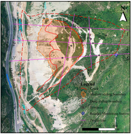 Figure 2 illustrates the topographic and geological features of the research area, focusing on the landslide site. The boundaries of the shallow and deep sliding zones are marked with red and orange dashed lines, respectively, while purple lines indicate profile lines for further investigation. Boreholes, represented by circles, are spread across the area for geological sampling. Rainfall monitoring stations are shown as blue diamonds. The nearby Heiai Road is displayed along the western side of the map. This layout helps analyze the spatial distribution of landslide features and related geophysical factors, offering a comprehensive understanding of the area’s risk and environmental conditions.