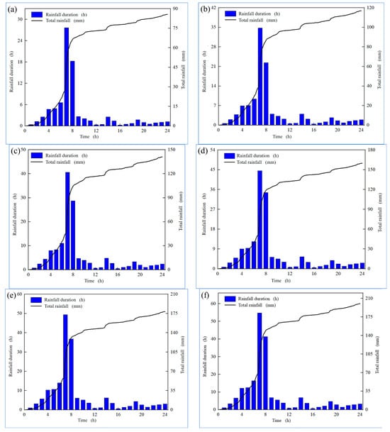 Rainfall duration curve. (a) 5-year return period; (b) 10-year return period; (c) 20-year return period; (d) 30-year return period; (e) 50-year return period; (f) 100-year return period.