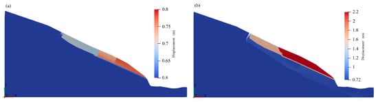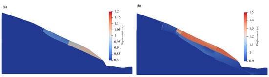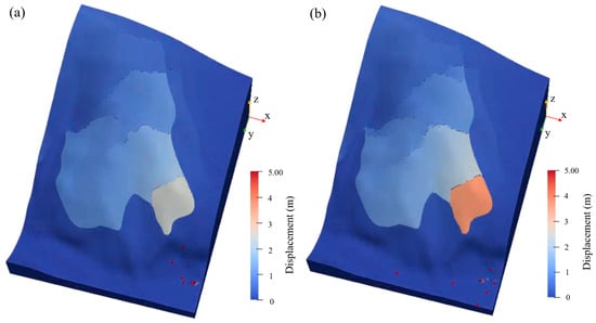 Deformation characteristics of the landslide under different reduction factors in the natural state. (a) Reduction factor of 1.06; (b) reduction factor of 1.12.