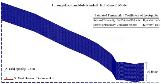 The rainfall calculation model for the Huangyukou landslide surface was generated based on the topological model (Figure 8). In the X direction, the grid is divided with a spacing of 4 m while, in the Z direction, a grid spacing of 0.5 m is used, generating 100 layers of grids. The boundary conditions of the hydrological model are Dirichlet fixed-head no-flow boundary conditions. The Richards equation is solved using the finite element method (FEM) with implicit time integration for handling complex geometries and heterogeneous soil conditions. Boundary conditions include a time-varying Dirichlet fixed head at the top, a no-flow Neumann condition at the bottom, and no-flow conditions at the lateral boundaries, reflecting the model’s symmetry and minimal horizontal seepage.