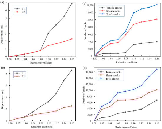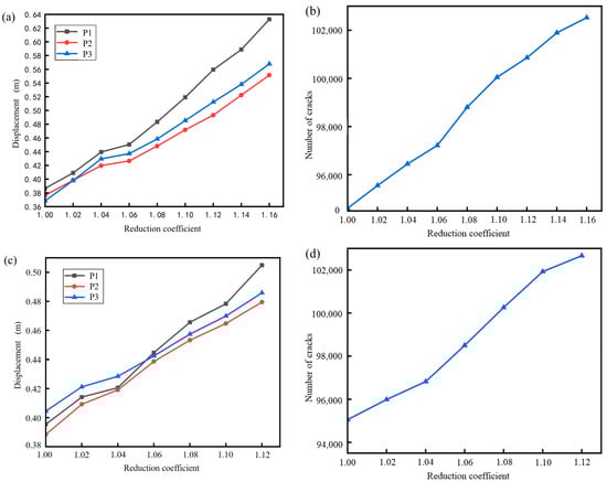 Displacement and crack number variation with reduction factor under the 20-year return period rainfall probability. (a,b) 20-year return period; (c,d) 100-year return period.