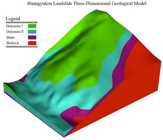 The geotechnical parameters of the soil and rock mass were obtained through laboratory tests on undisturbed samples from the boreholes. Combined with the engineering geological characteristics and lithological composition of the landslide, the material parameters used in the calculation and simulation are shown in Table 1. The dolostone layer, shale layer, and sandstone layer are all modeled using a cohesive–frictional material constitutive model.