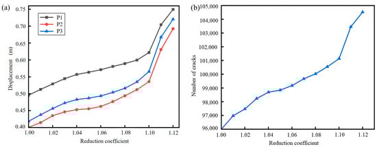 The graph of displacement and crack number variation with the reduction factor. (a) Displacement; (b) Number of cracks.