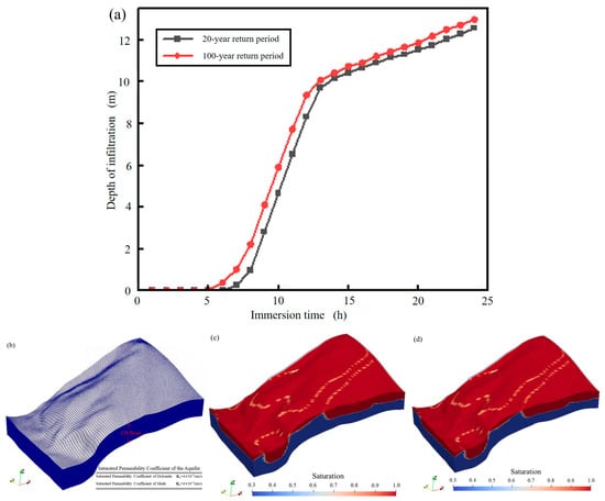 Infiltration moisture curves and saturation distribution cloud maps. (a) Infiltration depth change curve with time; (b) landslide rainfall hydrological model; (c) 20-year return period rainfall saturation cloud map; (d) 100-year return period rainfall saturation cloud map.