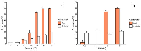 Effect of GMS dose (a) and contact time (b) on P recovery in synthetic and real wastewater.