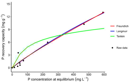 The equations derived from the Freundlich, Langmuir and Temkin models and their respective coefficients of determination appear in Table 2. Additionally, Figure 3 illustrates the P recovery isotherms generated from these models. We assessed the isotherm equations and observed that the Freundlich model demonstrated a superior fit to the experimental data, exhibiting a lower AIC value. Furthermore, the shape analysis of the Freundlich model curve indicated favorable recovery, with a value of n less than 1 (n = 1/1.124) [55]. However, this model does not specify the maximum recovery capacity of the tested material. From this perspective, the Langmuir model revealed a maximum recovery capacity of approximately 59.9 mg P g−1 and a recovery energy constant (KL) of 0.0004 L mg−1.