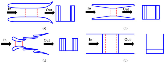 Numerical methods use iterative numerical solutions, making them more complex. One example is the method of singularities [13,14]. In this method, the number of blades, chord length, flow velocity, and rotor rotation speed are specified. The space between the blades is divided into n concentric cylindrical sections. Each of these sections is unfolded into a plane, forming a rectangular-shaped surface. It is assumed that, in each individual section, the blades are subjected to a uniform flow structure. In the method of singularities, the velocity at each point in the flow (including around the blade profile) can be calculated using Biot–Savart’s law. The method of singularities provides reliable results at small angles of attack, when there is no flow separation from the blade surface—but this does not fully correspond to real conditions. In order to optimize the blades for actual operation, the method of singularities can be combined with methods for analyzing the flow through the blade cascade (Table 1).