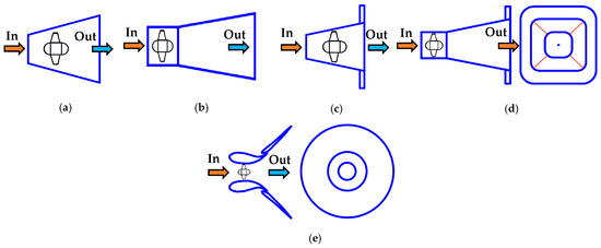 Different shapes of housing for axial hydrokinetic turbines: (a) diffuser, (b) shroud and diffuser, (c) diffuser with brim, (d) shroud and diffuser with brim, and (e) curved shroud with diffuser [6]. The arrows indicates flow direction.