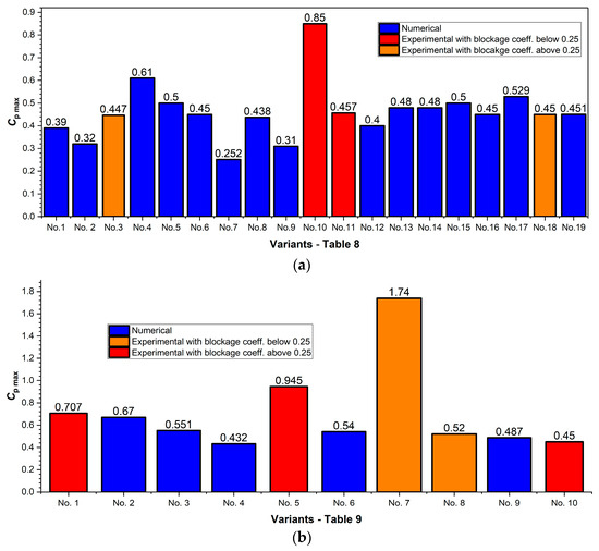 The data from the remaining studies are summarized in Table 8 (bare turbines) and Table 9 (shrouded turbines). In the first column, the study number is indicated; in the second column, the names of the researchers; in the third column, the established maximum power coefficient; and in the subsequent columns, the methods used for the synthesis and/or analysis of the turbine characteristics, the airfoil used, the flow velocity, the rotor distance from surrounding walls in the CFD model, the dimensions of the channel measurement section where the physical experiments were conducted, the main rotor diameter, the blockage coefficient (which should be below 0.25 to prevent flow acceleration around the rotor due to the constriction of the measurement section [24,25]), and the optimized parameters are indicated. The data are also visualized in Figure 3. in bar chart format. Most of these studies are numerical (the blue bars) and have not been validated with physical experiments. The calculated values of Cp can be used only for a comparative analysis of the accuracy of the numerical method applied, by evaluating the deviation (error) from actual values that can be determined experimentally.