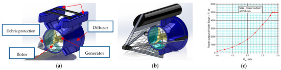 where T (Nm) is the torque of the turbine, ω (rad/s)—its the angular velocity, ρ is the density of the air/water (kg/m3), Sr (m2) is the swept area of the rotor (m2), and Cw (m/s) is the flow velocity in front of the rotor. Since Pflow depend on the flow velocity, it is common practice to use specially profiled hydrodynamic channels (Figure 1). These channels operate on the Venturi principle [10]. By constricting the cross-section in the working area, they locally increase the flow velocity in front of the turbine. In axial hydrokinetic turbines, the rotor can be places in diffuser-shaped housing, which achieves a similar result (Figure 2). In the first version, the rotor was placed in front of the diffuser entrance (a). Later, a straight cylindrical part (shroud) was added, which stabilizes the flow through the rotor (b). Subsequently, a brim diffuser was added, which increases the pulling force through the flow passage due to the vortices formed after brim (c) and (d). The last variant (e) is a curved shroud and diffuser, optimized according to the flow pattern. With these diffusers, the values of Cp can even exceed the Betz limit [11], which represents the theoretical maximum of 0.59.