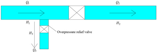 where , , are the flow rates upstream, downstream, and in front of the overpressure relief valve, , , , are the pressure heads upstream, downstream and in front of the overpressure relief valve, m, respectively.
