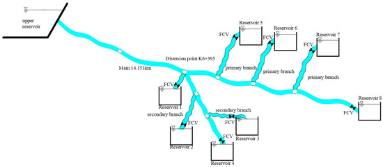 The JH Project, located in a designated area of Xinjiang, aims to enhance regional agricultural irrigation efficiency and promote sustainable water resource utilization through systematic infrastructure modernization. As a medium-scale irrigation district development initiative, its primary objectives involve upgrading hydraulic infrastructure to increase agricultural water supply reliability, optimizing irrigation water distribution networks for improved farmland productivity, implementing precision water delivery systems to boost crop yields and farmer incomes. Figure 2 illustrates the schematic layout of the high-head gravity-fed bifurcated water conveyance network, comprising elevating farmland irrigation efficiency, thereby increasing crop yields and farmers’ income levels. As shown in Figure 2, the JH high-head gravity-fed water transmission system comprises an upstream reservoir (elevation: 396.4 m), steel pipelines (main pipe: 14.153 km, branches: 4.105 km total), butterfly valves for flow control, and a terminal storage reservoir. The pipes extend to the end of the reservoir through the four sections of gradual change of pipe diameter, namely DN800, DN600, DN400, and DN315.