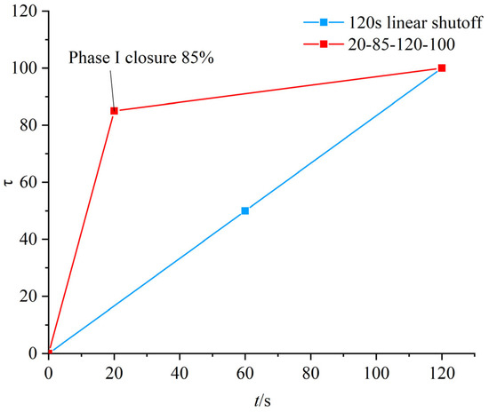 According to Table 2, extending the linear closure time of Valve 1 to 30 s reduces the maximum instantaneous pressure in the branch pipeline before Water Storage Tank 1 by 8%. For Valves 2 to 8, extending the linear valve closure time reduces the maximum instantaneous pressure by 29.4%, 44.4%, 45.6%, 25.6%, 44.5%, 26.9%, and 54.7%, respectively. For Valves 6 to 8, the negative pressure is eliminated by 87%, 77%, and 100%. Extending the linear valve closure time can ensure that the positive pressure in the pipeline meets the required standards and also helps eliminate the negative pressure. However, extending the valve closure time reduces the efficiency of valve closure. For example, Valve 8, which is located at the end of the main pipeline, has a larger pipe diameter, pipe length, and transient pressure surge due to water hammer. To reduce the transient pressure surge, a longer extension time is needed, which results in low operational economy. Therefore, a two-stage valve closure method is proposed to reduce the water hammer pressure.