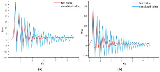 This study establishes a one-dimensional mathematical model of water transmission pipelines based on the method of characteristics validated against experimental results for hydraulic transient conditions in branch-type pipe networks reported by Shi Xi et al. [13]. The validation process involves mathematical modeling of their physical test setup under identical operational conditions, specifically obtaining pressure fluctuations upstream of the valve under different closure durations. Comparative analysis between simulation results and experimental data (Figure 4) demonstrates good agreement. For Case 1, the modeled maximum head (Hmax) at the valve reaches 32 m versus experimental 28.9 m, yielding a relative error of 9.6%. For Case 2, the calculated Hmax of 34 m compares with measured 36.5 m, showing 7.4% relative error. Both cases exhibit consistent temporal alignment in achieving peak water hammer pressures. This validation confirms the model’s capability to simulate valve-induced water hammer phenomena with appropriate parameter configuration.