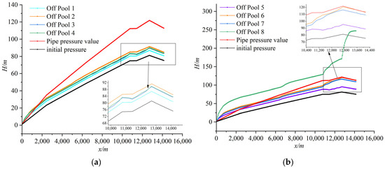 Table 4 shows the maximum and minimum pressures in the branches and main pipe when only the valves between the branches are closed in combination, while Table 5 shows the maximum and minimum pressures in the branches and main pipe when all valves are closed in combination. As seen from Table 4, when multiple valves are closed in a 10 s linear fashion under different operating conditions, the maximum positive pressure in the pipeline does not meet the required standard, and the minimum negative pressure in some parts does not meet the requirement. Moreover, when the valves between the branches are closed in combination, and the main pipe valves remain open while the other valves are closed, the maximum pressure in the main pipe occurs near K12+953, i.e., close to the water split point of the terminal branch.