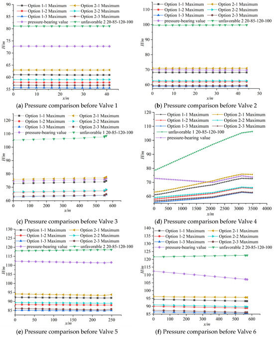 Comparison of pressure before each valve. Note: In this set of simulations, under Scenarios 1 and 2, the minimum pressure in the pipeline is greater than the pressure-bearing value (negative pressure), so Figure 6 only shows the maximum pressure.