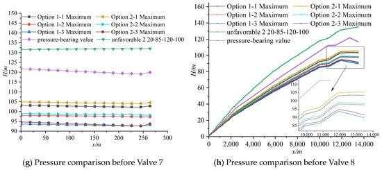 From Figure 6, it can be seen that for the positive pressure protection effect, the order of effectiveness is Scheme 2-1 > Scheme 1-1 > Scheme 2-2 > Scheme 1-2 > Scheme 2-3 > Scheme 1-3. From Figure 6a, it can be observed that in this set of data, the maximum pressure in the pipelines of all six schemes is less than the pressure rating. Scheme 2-1 has a maximum pressure greater than the other five schemes. The pipeline pressures in the six schemes are 13.1–23.5% lower than the pressure rating, and the pressures are 27.2–31.3% lower compared to the Most Adverse Operating Condition 2 using the 20-85-120-100 valve closing. Similarly, from Figure 6b,c, Scheme 2-1 has a maximum pressure that is at most 2.8% and 2.7% higher than the pressure rating, respectively. Only Scheme 2-1 fails to meet the required pressure, but the pipeline positive and negative pressures in the other five schemes all meet the requirements. From Figure 6b, the pipeline pressures in the six schemes are 28.8–40.1% lower compared to the Most Adverse Operating Condition 2 using the 20-85-120-100 valve closing. From Figure 6c, the pipeline pressures in the six schemes are 27.9–20.3% lower compared to the Most Adverse Operating Condition 1 using the 20-85-120-100 valve closing (Most Adverse 1 has the highest pressure in Branch Pipes 3 and 4). From Figure 6d, it can be seen that the maximum pressure of Scheme 2-1 exceeds the pressure rating before 2000 m. This is because K1-0+000-2 and K1-0+000-3 are the starting points of the second and third secondary branch pipes, which leads to a decreasing trend in the working pressures at these two locations, and consequently a corresponding decrease in the pressure rating. Therefore, except for Scheme 2-1, the pipeline positive and negative pressures in the other five schemes all meet the requirements. From Figure 6e–h, it can be seen that the pipeline positive and negative pressures in all six schemes meet the requirements. The Most Adverse Condition 2 has relatively high pressures in the corresponding branch pipes in each figure, and Scheme 2-1 has a smaller pressure relief valve outlet diameter compared to Schemes 2-2 and 2-3. Therefore, in the six schemes, Scheme 2-1 has a higher pressure than the other five schemes. In Figure 6e–g, the pipeline pressures in the six schemes are 16.2–24.2%, 9.8–23.14%, and 13.3–20.6% lower compared to the pressure rating, respectively. The pipeline pressures in the six schemes are 20.2–27.9%, 20.8–28.9%, and 20.3–26.6% lower compared to the Most Adverse Operating Condition 2 using the 20-85-120-100 valve closing. In Figure 6h, the maximum pressure before the valve in all six schemes is 9.7–22.9% lower than the pressure rating, and the maximum pressure before the valve in all six schemes is 21.8–33.3% lower compared to the Most Adverse Operating Condition 2 using the 20-85-120-100 valve closing.